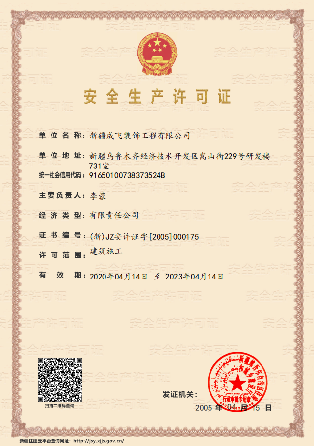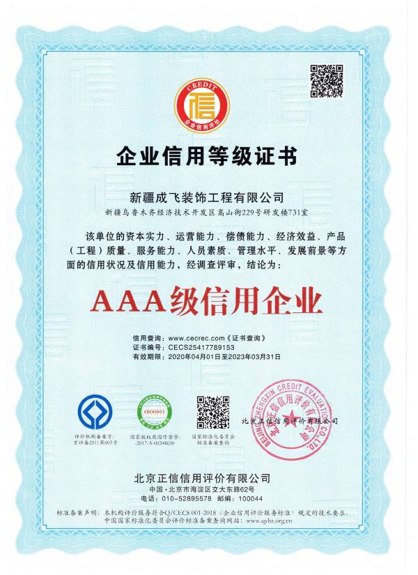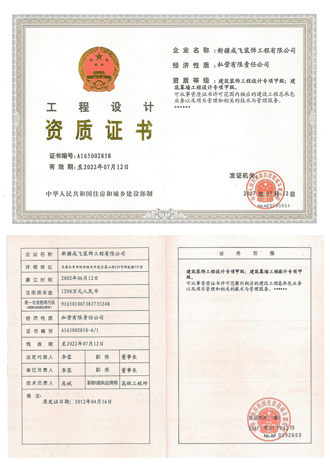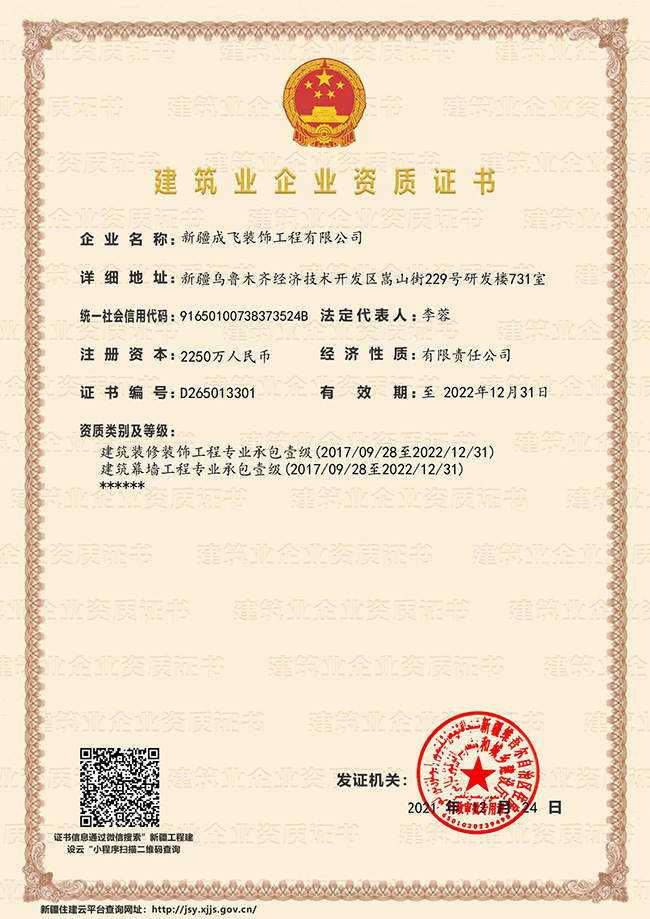 新疆成飛建設(shè)工程有限公司是一家以專注于裝飾工程領(lǐng)域,堅(jiān)持穩(wěn)健經(jīng)營、持續(xù)創(chuàng)新、開放合作的原則,在星級(jí)賓館、高檔寫字樓、大型商場(chǎng)、高級(jí)餐館、娛樂設(shè)施、車站、銀行等大型室內(nèi)外建筑工程(包括各類玻璃幕墻、石材幕墻、鋁板幕墻、鋼結(jié)構(gòu)室內(nèi)裝飾等工程)裝飾裝修...查看更多